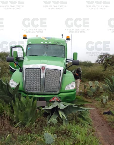 Sobre un camino de terracería cerca de la Carretera federal 57 San Luis Potosí– Matehuala en Estación Ventura, elementos de la GCE recuperaron un tractocamión Kenworth, 2022, color verde, acoplada a dos remolques tipo cisterna cargados en total con 68 mil litros de gasolina. Fue hallado abierto y faltándole los neumáticos de los dos ejes traseros.