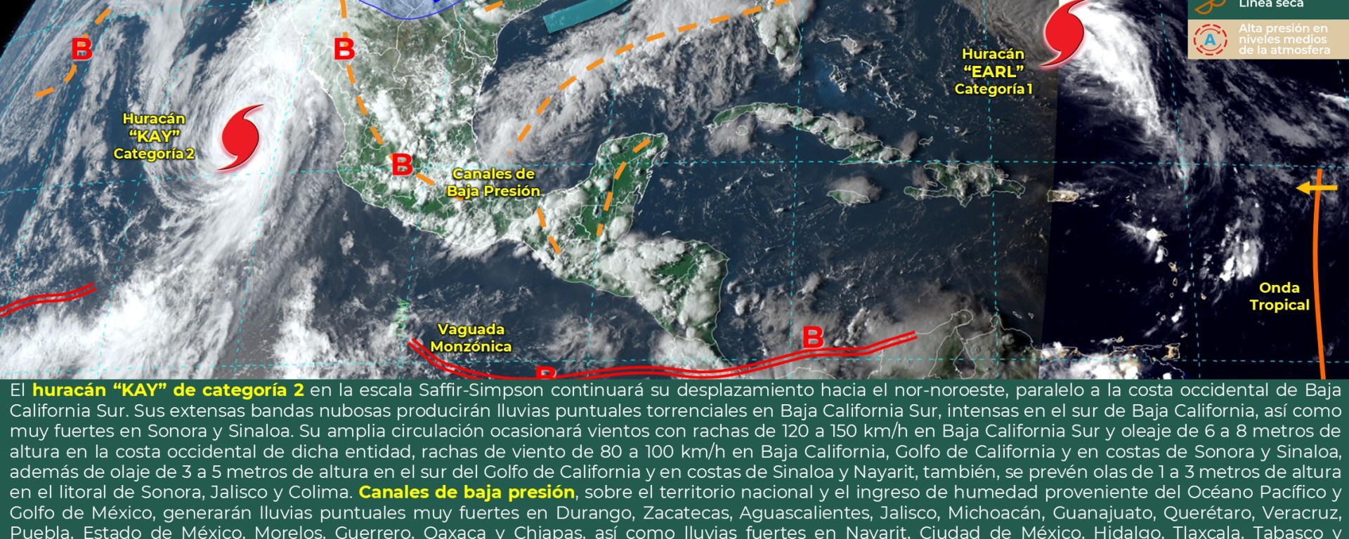 Oleaje de 7 a 9 metros de altura: costa occidental de Baja California y Baja California Sur.