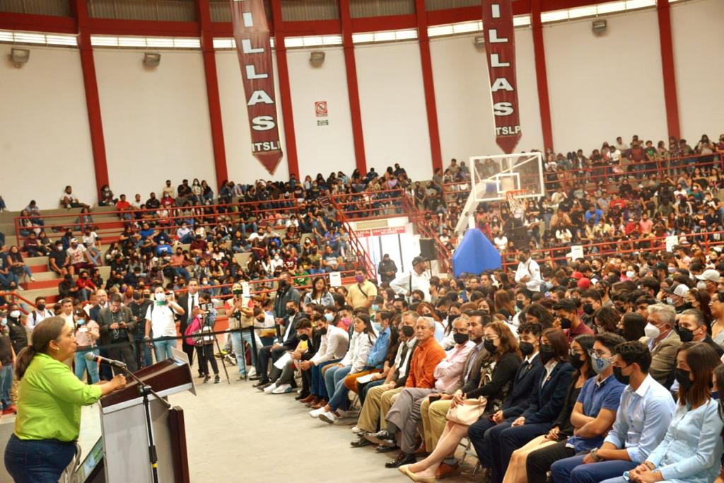 Durante su intervención la alcaldesa de Soledad de Graciano Sánchez, Leonor Noyola Cervantes, reconoció el esfuerzo que diariamente realizan los padres de familia para que sus hijos continúen con su preparación.