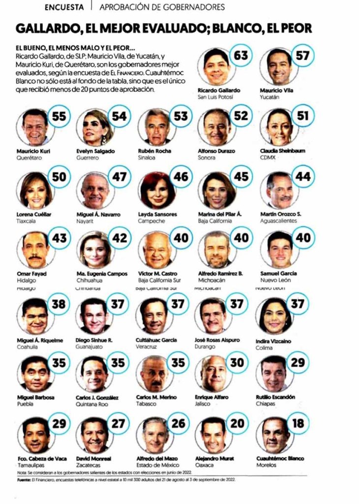 Por debajo del nivel de aprobación de 30 por ciento se ubican los Gobernadores de Chiapas, Tamaulipas, Zacatecas, Estado de México, Oaxaca y Morelos.