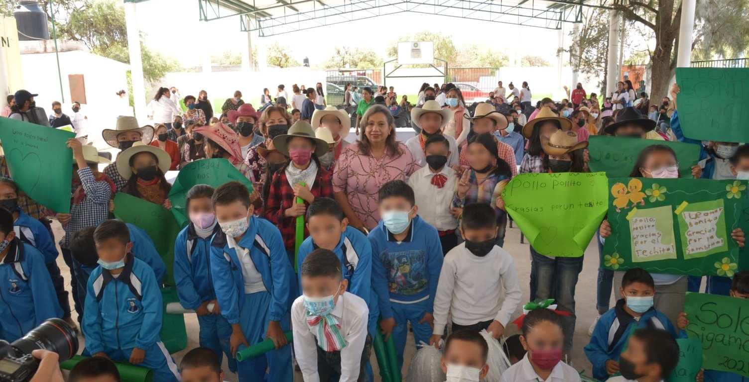 La alcaldesa de Soledad de Graciano Sánchez, Leonor Noyola Cervantes inauguró este miércoles el techado del patio cívico de la escuela primaria rural Álvaro Obregón ubicada en la comunidad de la Tinaja.