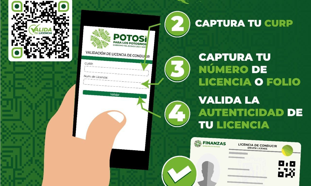 El programa “Valida Tu Licencia” ya se encuentra disponible en la siguiente liga: https://validatulicencia.slpfinanzas.gob.mx, en donde el ciudadano deberá capturar su CURP y folio o número de licencia y el sistema arrojará datos: Tipo de Licencia; Fecha de Emisión y Vigencia; Letra y Folio de Recibo de Pago; Número de Licencia; Fotografía de la Persona; Marca de Agua con el logotipo de Gobierno; Marca de Agua con la Fecha y Hora actual de la validación y el botón de visualización del Recibo de Pago.