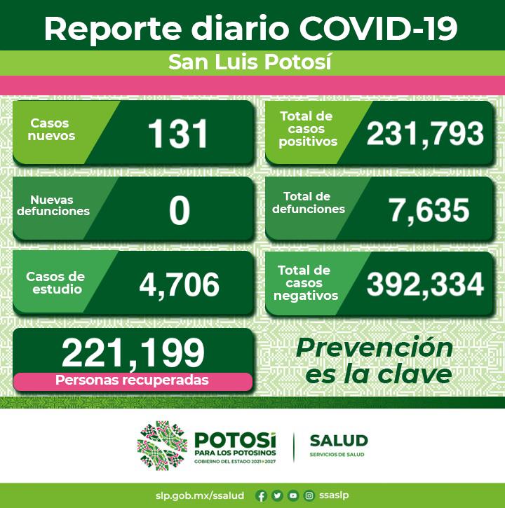 No se reportan nuevas defunciones, por lo que la cifra de muertes en el Estado permanece en 7 mil 635. Sobre los estudios de nuevos casos, 62 son mujeres y 69 hombres en un rango de edad de 5 meses a 84 años. Para este día, se encuentran hospitalizadas cuatro personas, ninguna requiere de respiración asistida.