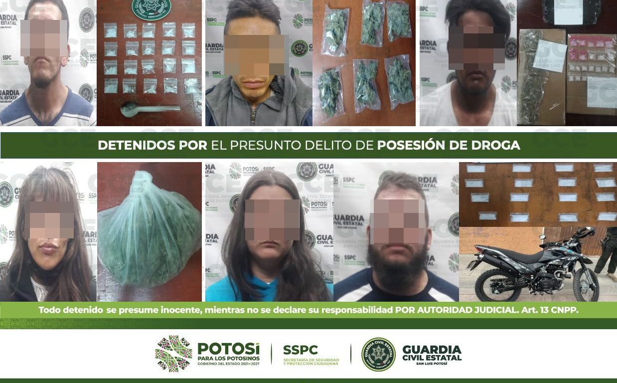 Como resultado del Plan Integral de Seguridad implementado en este nuevo gobierno para combatir de manera frontal la delincuencia y preservar la paz de la ciudadanía potosina, policías de la Guardia Civil Estatal (GCE) aseguraron 87 dosis de droga y detuvieron a 10 personas por presunta posesión de estupefacientes.
