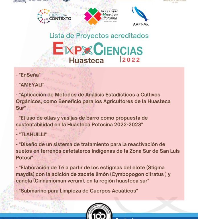 Así como “Diseño de un sistema de tratamiento para reactivación de suelos en terrenos cafetaleros indígenas de la Zona Sur de San Luis Potosí”, y “Elaboración de Té a partir de los estigmas de elote con la edición de zacate limón en la región Huasteca Sur”.
