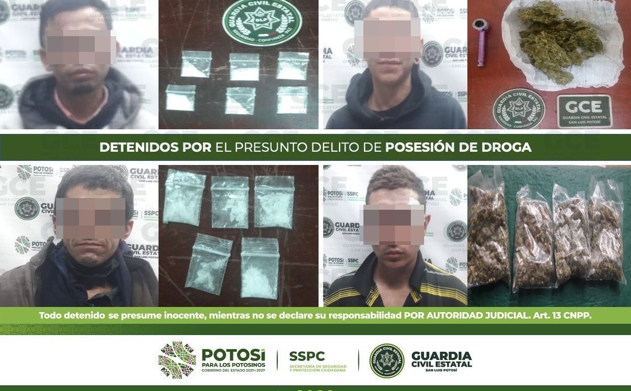 A través de las acciones operativas a efecto de reforzar la seguridad en la Entidad potosina, así como prevenir conductas constitutivas de delito, en distintos operativos, elementos de la Guardia Civil Estatal (GCE) aseguraron 42 dosis de enervantes y detuvieron a 8 personas por el presunto delito de posesión de droga.