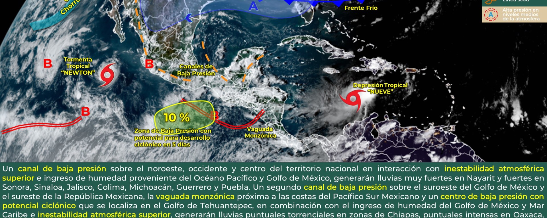 Intervalos de chubascos (5 a 25 mm): Chihuahua, Durango, Sinaloa, Nayarit, Jalisco, Colima, Michoacán, Tamaulipas, Hidalgo, Estado de México, Ciudad de México, Tlaxcala, Yucatán y Quintana Roo.