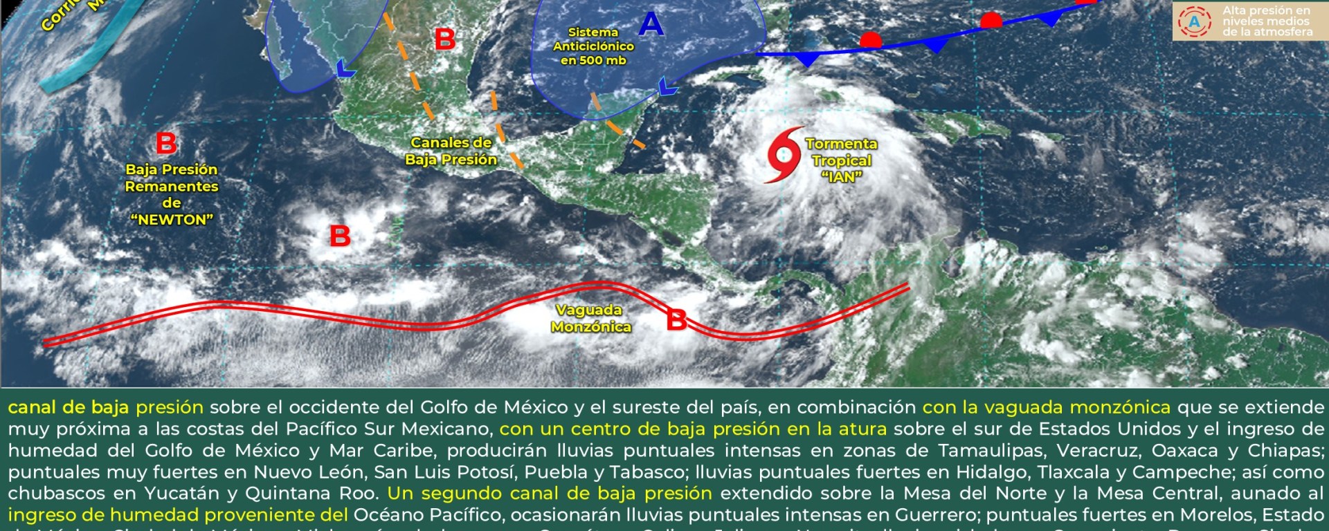 Lluvias muy fuertes con puntuales intensas (75 a 150 mm): San Luis Potosí, Hidalgo, Puebla, Veracruz, Oaxaca y Chiapas.