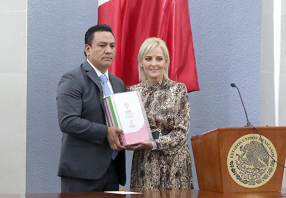 La diputada Aranzazu Puente Bustindui, presidenta de la Directiva del Congreso del Estado, recibió del Secretario General de Gobierno, J. Guadalupe Torres Sánchez, en representación del Gobernador del Estado, José Ricardo Gallardo Cardona, el Primer Informe de Gobierno Estatal de la administración 2021-2027.