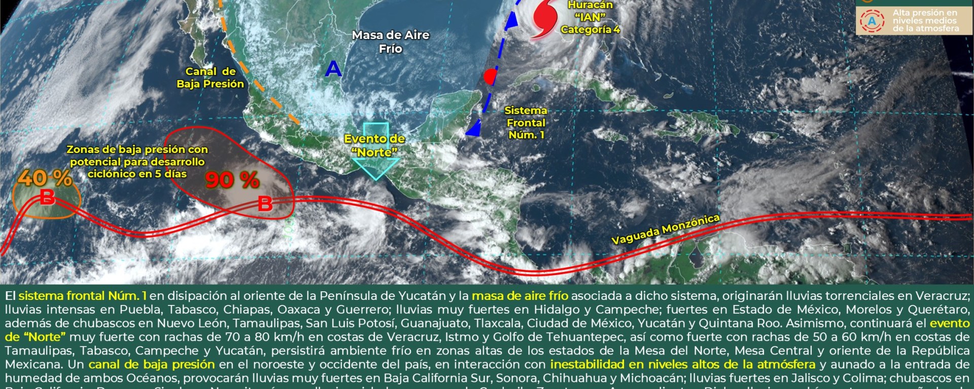 Evento de “Norte” con rachas de 70 a 90 km/h: Istmo y Golfo de Tehuantepec, con rachas de 60 a 70 km/h: costa de Veracruz, y con rachas de 40 a 50 km/h: costas de Tamaulipas, Tabasco y Campeche.