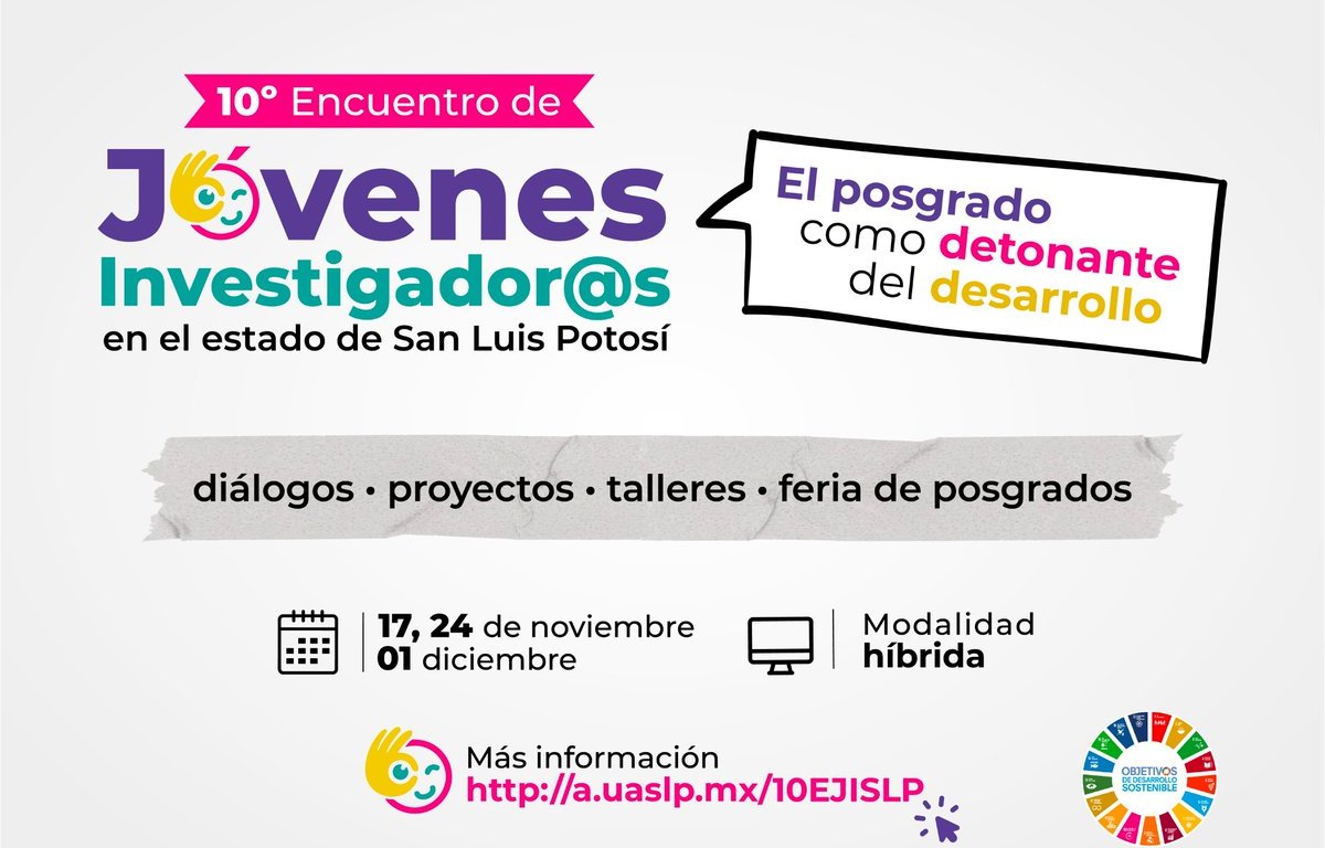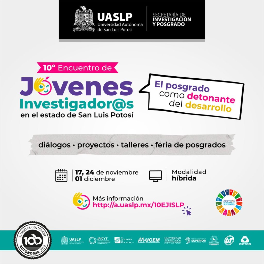 La Secretaría de Investigación y Posgrado (SIP) de la Universidad Autónoma de San Luis Potosí (UASLP) invita a estudiantes del último año de licenciatura y técnico superior universitario, pasantes y recién titulados de las Instituciones de Educación Superior públicas y privadas de la entidad, a participar en el 10º Encuentro de Jóvenes Investigador@s en el Estado de San Luis Potosí.