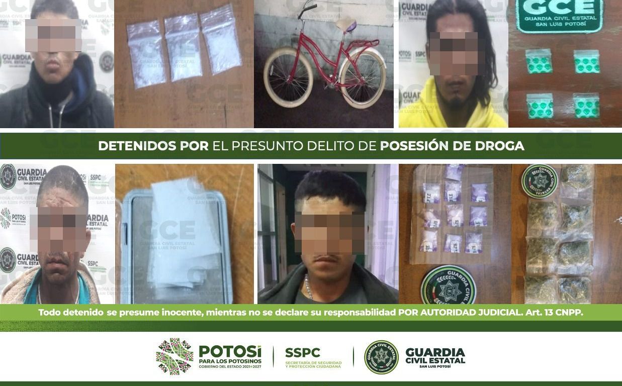 Como resultado de las labores preventivas del Plan Integral de Seguridad, implementado para inhibir hechos que vulneren el bienestar público; en distintas acciones, agentes de la Guardia Civil Estatal (GCE) detuvieron a 8 personas por el presunto delito de posesión de droga y aseguraron 58 dosis de estupefacientes.