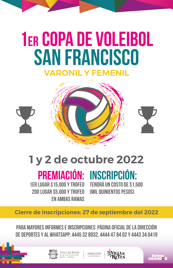 El H. Ayuntamiento de Villa de Reyes a través de la dirección de Deportes Municipal llevará a cabo la Primera Copa de Voleibol “San Francisco” los próximos días 1 y 2 de octubre.