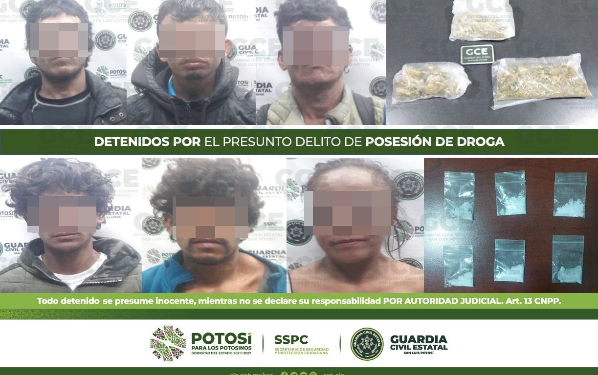 En el marco del Plan Integral de Seguridad que implementa el Gobierno del Estado en los 58 municipios de San Luis Potosí, con el propósito de disminuir la incidencia delictiva; en distintas acciones, policías de la Guardia Civil Estatal (GCE) aseguraron 75 dosis de estupefacientes y detuvieron a 12 personas por presunta posesión de droga.