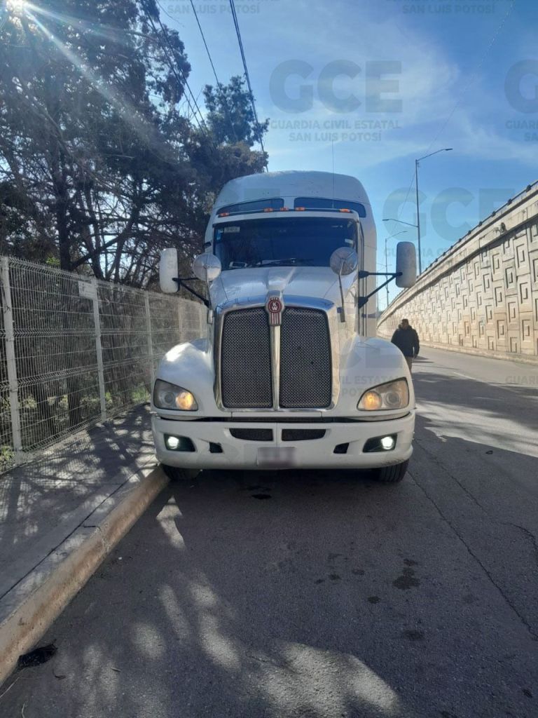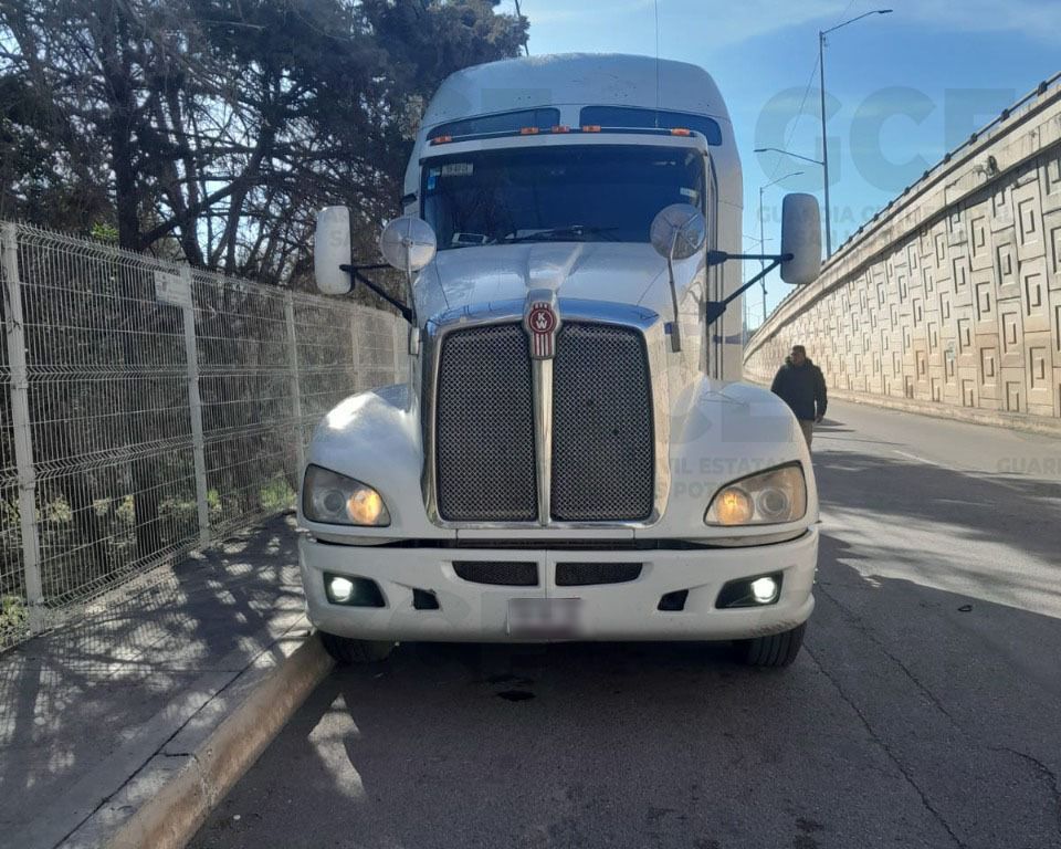 Sobre Anillo Periférico en la comunidad El Zapote, también en el municipio conurbado; se aseguró un tractocamión marca Kenworth, color blanco, modelo 2012. Contaba con reporte de robo el 30 de septiembre del año en curso.