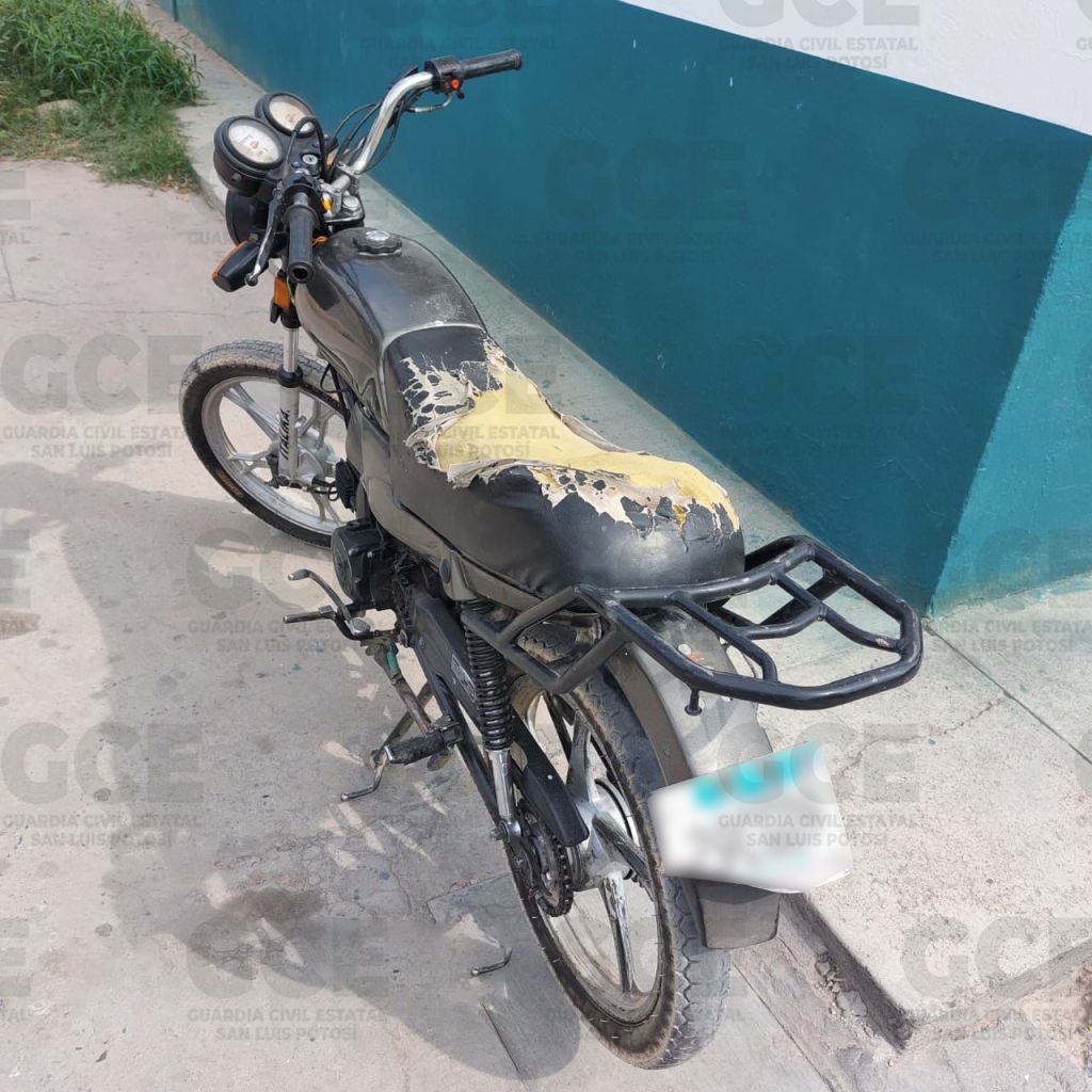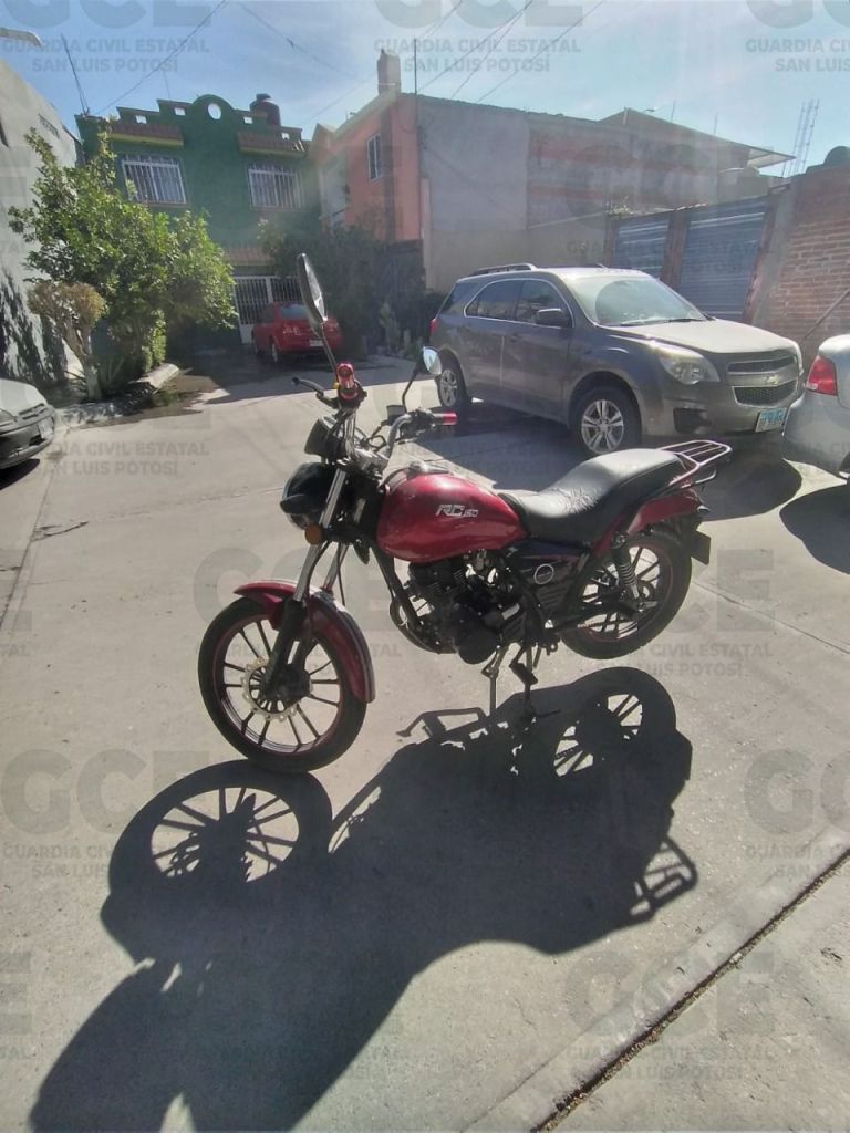 Dentro de los operativos en la Privada de San Pedro en la colonia San Francisco del municipio de Soledad de Graciano Sánchez, los uniformados aseguraron una motocicleta marca Italika, color rojo, modelo 2018. Tenía reporte de robo el 26 de septiembre del año en curso, en la colonia Rinconadas.