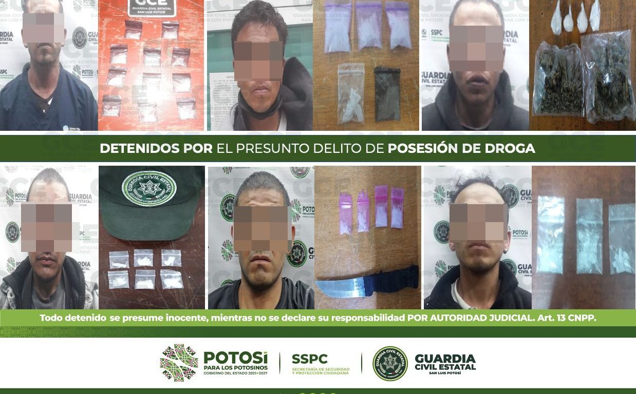 En diferentes acciones, y como parte de los operativos preventivos y disuasivos para inhibir hechos constitutivos del delito, agentes de la Guardia Civil Estatal (GCE) detuvieron a 11 personas por el presunto delito de posesión de droga y aseguraron 63 dosis de estupefacientes.