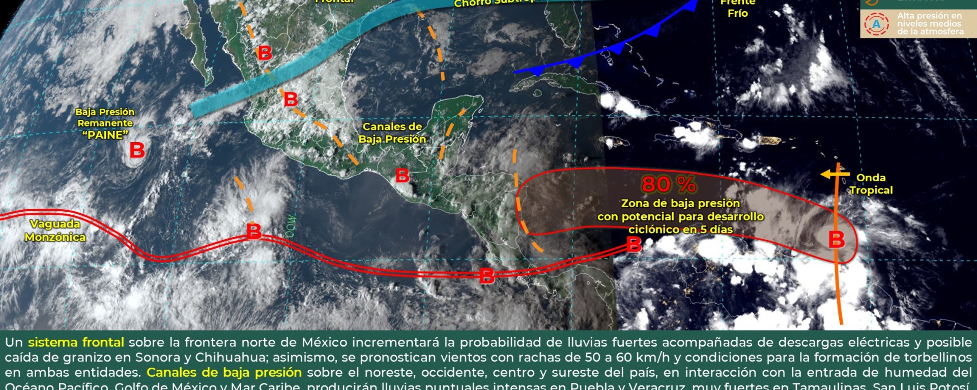 Intervalos de chubascos con lluvias puntuales fuertes (25 a 50 mm): Sonora, Tamaulipas, Durango, Michoacán, Guerrero, Morelos, Ciudad de México, Estado de México, Querétaro, Hidalgo, Tlaxcala, Puebla, Veracruz, Oaxaca, Chiapas y Tabasco.
