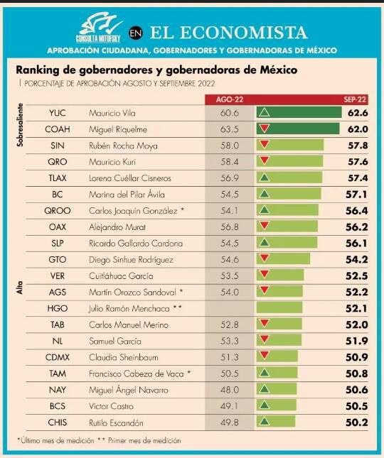 De acuerdo a la publicación, el Gobernador de San Luis Potosí, se ubica entre las y los Mandatarios con Alta aprobación, por arriba de Guanajuato, Veracruz, Aguascalientes, Hidalgo, Tabasco y Nuevo León, con una media nacional de 49.9 por ciento.