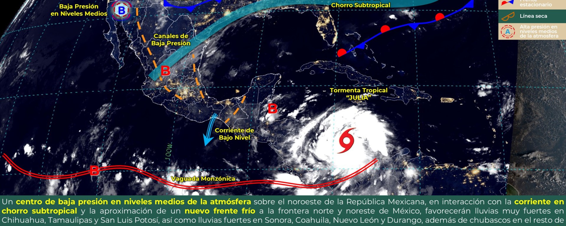 Lluvias fuertes con puntuales muy fuertes (50 a 75 mm): Chihuahua, Tamaulipas, San Luis Potosí, Hidalgo, Oaxaca, Chiapas y Tabasco.
