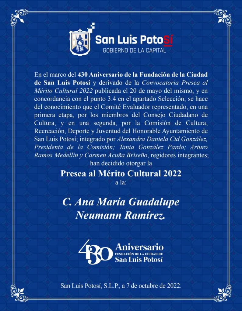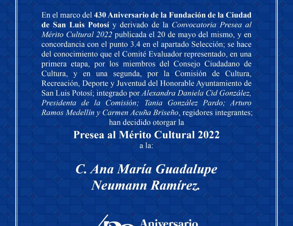En el marco del 430 Aniversario de la Fundación de la Ciudad de San Luis Potosí y derivado de la Convocatoria Presea al Mérito Cultural 2022, publicada el 20 de mayo del mismo; en concordancia con el punto 3.4 en el apartado Selección; se hace del conocimiento que el Comité Evaluador, representado en una primera etapa por los miembros del Consejo Ciudadano de Cultura; y en una segunda por la Comisión de Cultura, Recreación, Deporte y Juventud del Honorable Ayuntamiento de San Luis Potosí; integrado por Alexandra Daniela Cid González, Presidenta de la Comisión; Tania González Pardo; Arturo Ramos Medellín y Carmen Acuña Briseño, regidores integrantes, decidieron otorgar la:
