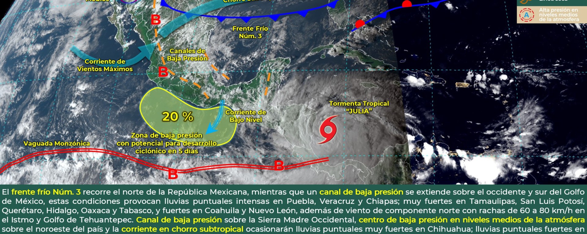Evento de “Norte” con rachas de 60 a 80 km/h: costa de Veracruz e Istmo y Golfo de Tehuantepec, y con rachas de 40 a 60 km/h en las costas de Tamaulipas, Tabasco y Campeche.