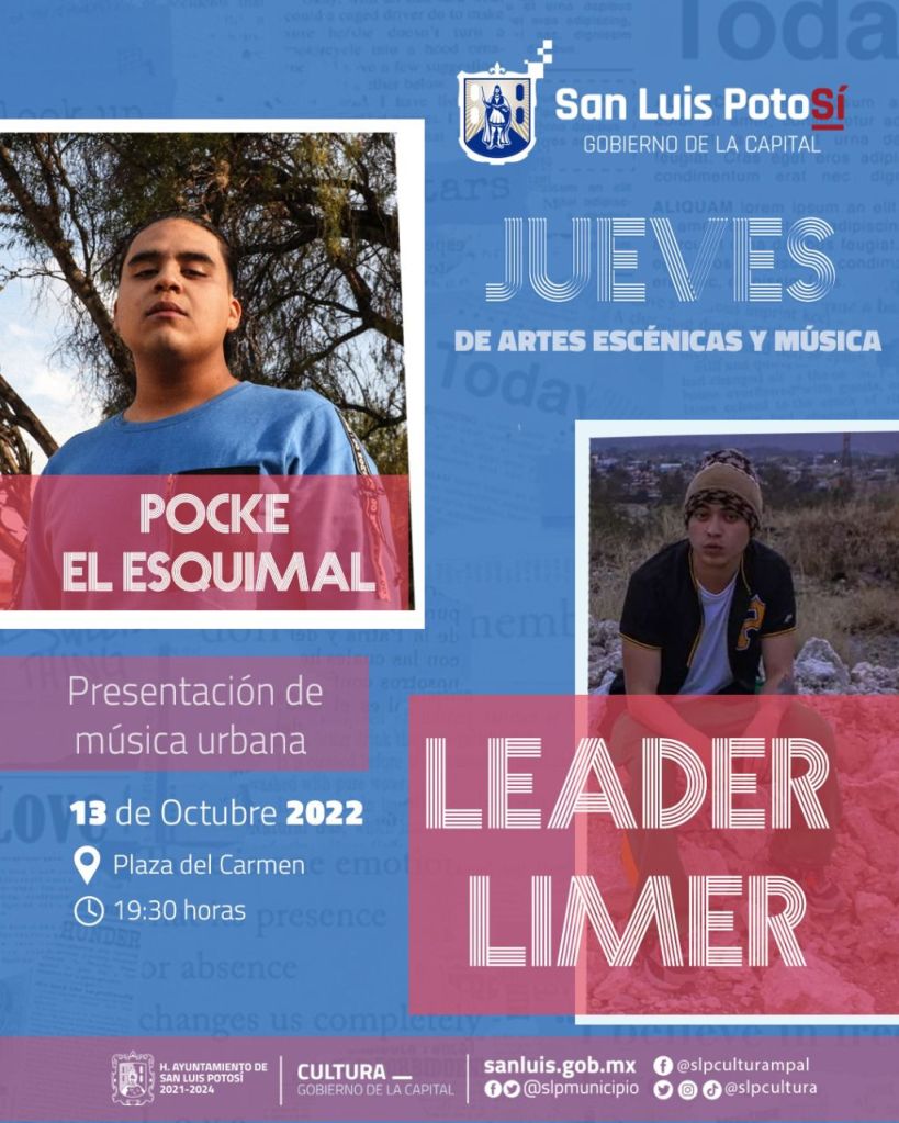 La Dirección de Cultura Municipal, mantiene el apoyo y difusión de los artistas locales e independientes en las diferentes disciplinas, y como parte del programa Jueves de Artes Escénicas y Música, este 13 de octubre a las 19:30 horas en la Plaza del Carmen se presentan los músicos del género urbano “Leader Limer” y “Pocke El Esquimal”.