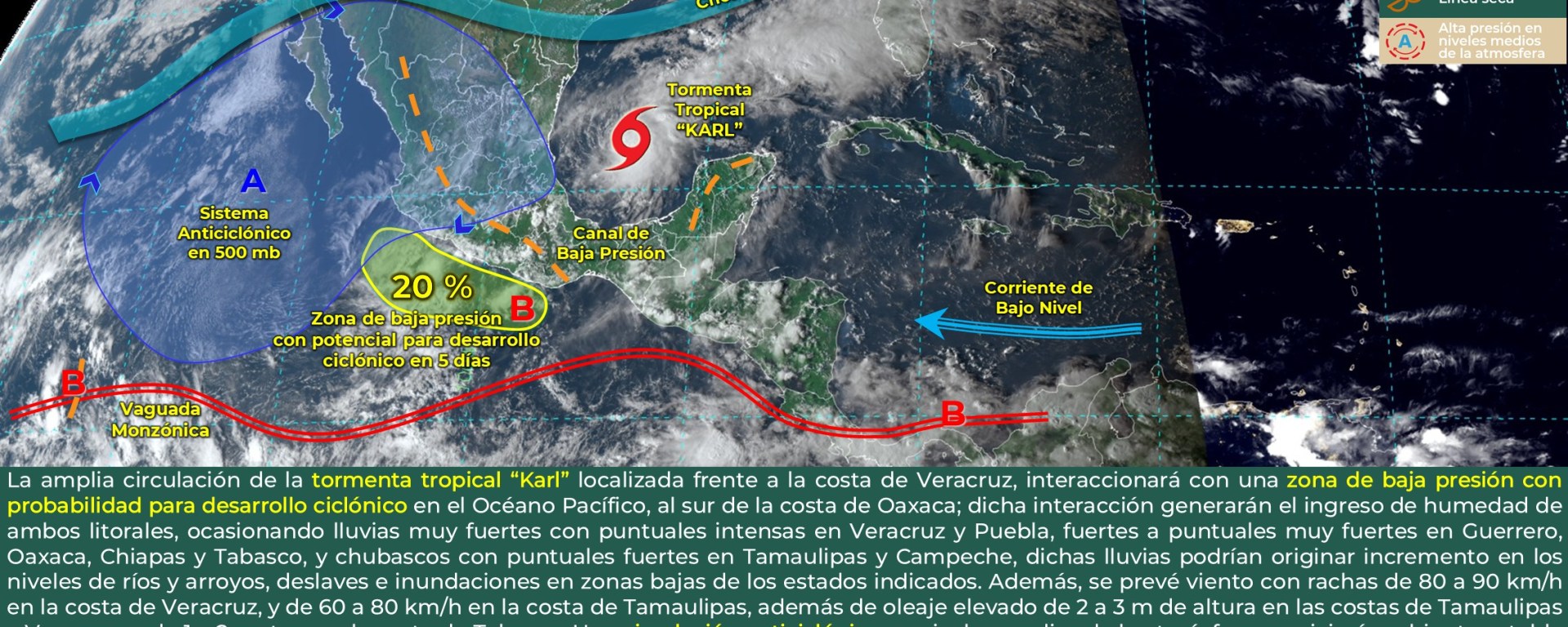 Oleaje de 2 a 3 metros de altura: costa de Veracruz, y de 1 a 2 metros de altura: costas de Tamaulipas (sur) y Tabasco.