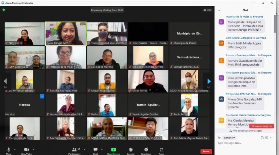 Al realizar un encuentro virtual con las directoras de las Instancias Municipales de la Mujer (IMM) y enlaces de masculinidades, la nueva directora del área de Transversalidad del Instituto de las Mujeres del Estado (Imes), Nelly Adriana López Soto, reafirmó el compromiso de impulsar acciones que favorezcan el desarrollo integral de las mujeres, de acuerdo con la política social del Gobernador de San Luis Potosí, Ricardo Gallardo Cardona.