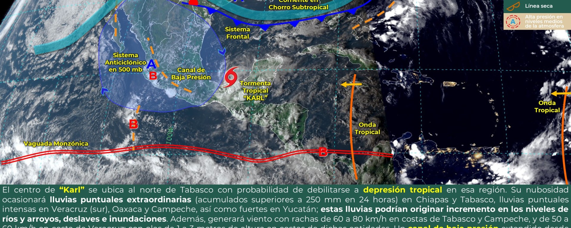 Lluvias fuertes con puntuales muy fuertes (50 a 75 mm): Tabasco.