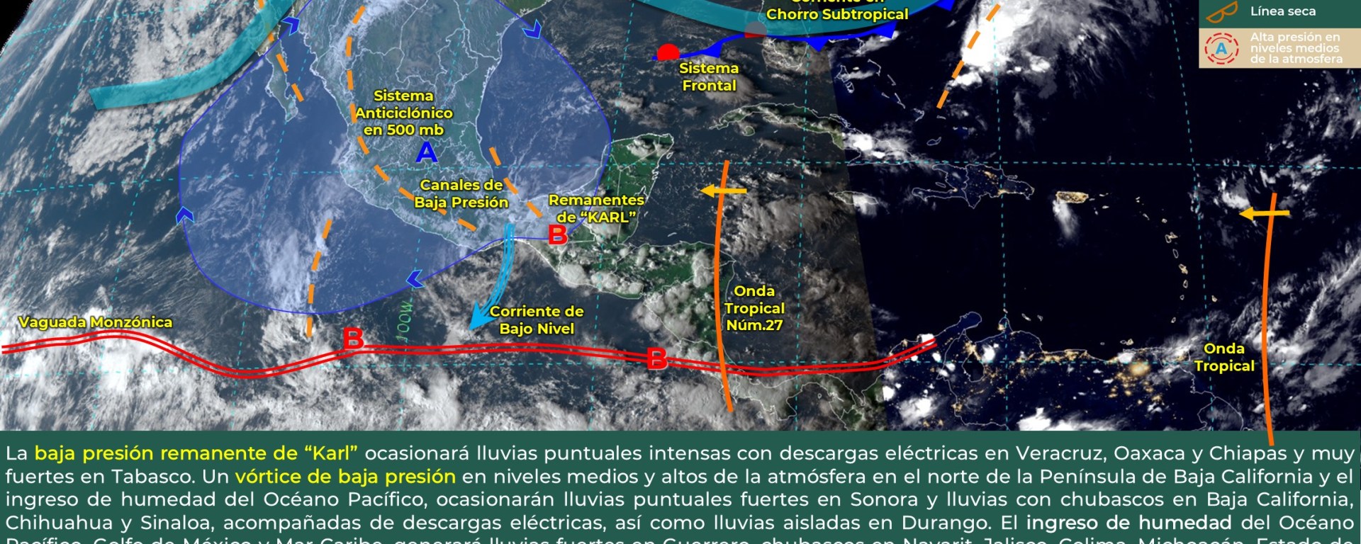 Intervalos de chubascos: Sonora, Nuevo León, Jalisco, Colima, Ciudad de México, Morelos, Puebla, Tlaxcala, Hidalgo, Tabasco, Campeche, Yucatán y Quintana Roo.