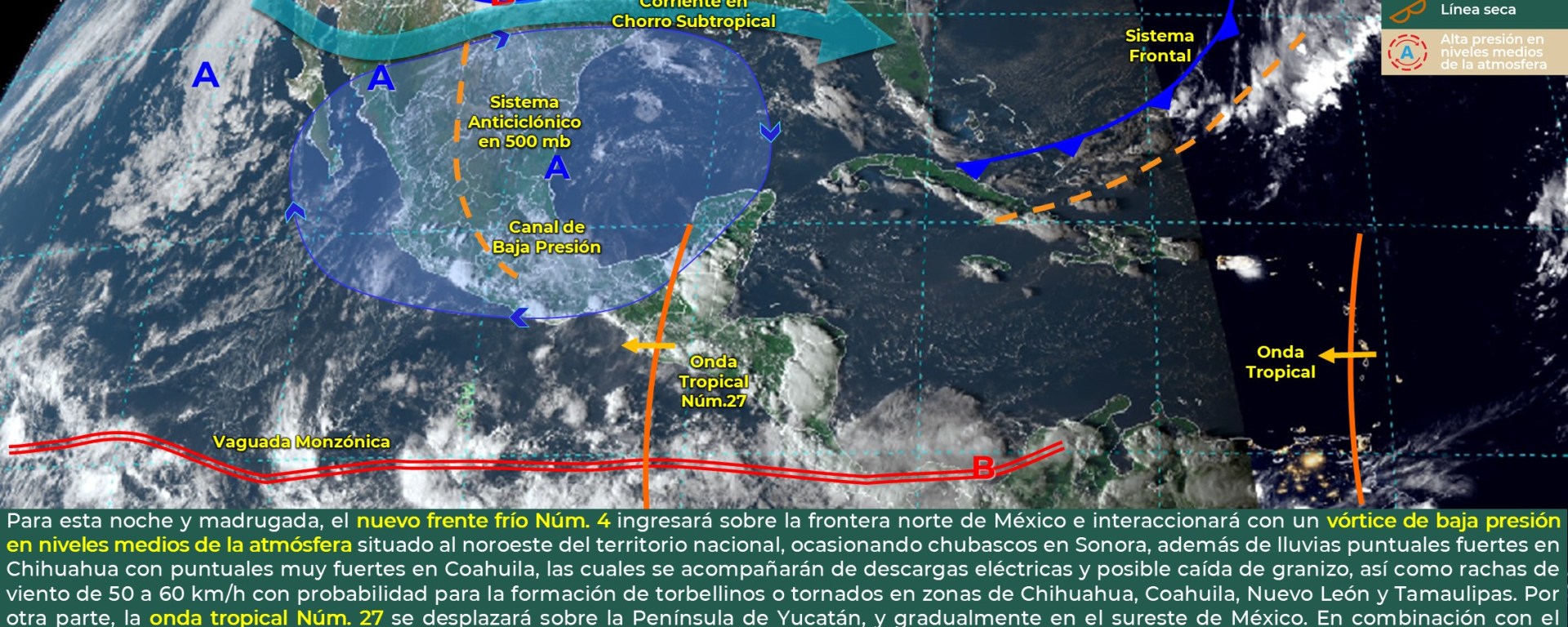 Cielo despejado por la mañana e incremento de nubosidad por la tarde. Lluvias aisladas en Aguascalientes, chubascos en Chihuahua, Durango, Zacatecas y San Luis Potosí; lluvias muy fuertes con puntuales intensas en Coahuila y Nuevo León, acompañadas de descargas eléctricas y posible caída de granizo. Ambiente fresco por la mañana, siendo frío en zonas serranas, con temperaturas menores a 5°C y heladas en sierras de Chihuahua y Durango. Ambiente vespertino templado a cálido. Viento del este y noreste de 20 a 35 km/h en la región, con rachas de 60 a 70 km/h y posible formación de torbellinos o tolvaneras en Coahuila y Nuevo León.