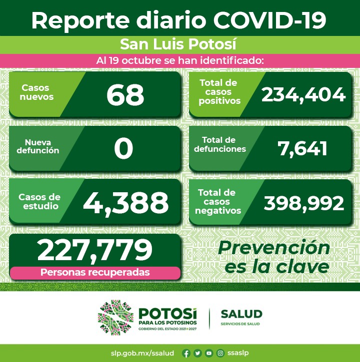 Un día más sin defunciones registradas, por lo que la cifra de muertes en el Estado se mantiene en 7 mil 641, sobre los estudios de nuevos casos, 43 son mujeres y 25 hombres en un rango de edad de 11 meses a 81 años. Siete personas se encuentran hospitalizadas, de las cuales ninguna requiere de respiración asistida