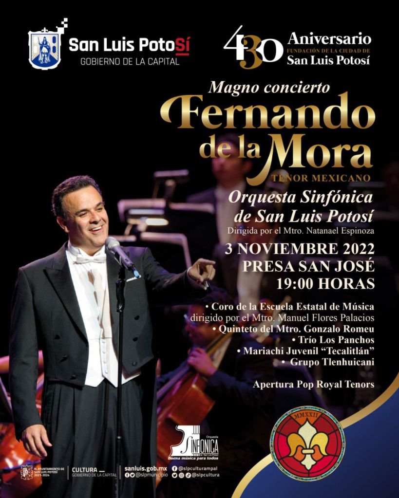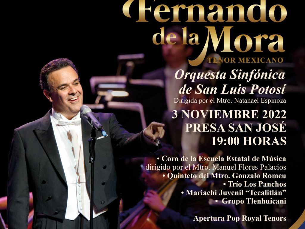 En el marco del 430 Aniversario de la Fundación de la ciudad de San Luis Potosí, el Gobierno de la Capital, a través de la Dirección de Cultura Municipal, alista el Magno Concierto del Tenor Mexicano Fernando de la Mora, acompañado de la Orquesta Sinfónica del Estado de San Luis Potosí, mismo que se desarrollará en la cortina de la Presa San José el próximo 3 de noviembre a las 7 de la noche, un evento gratuito con cupo limitado.