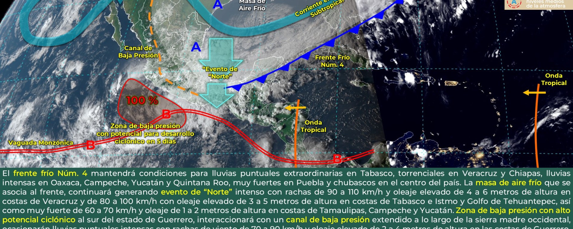 Evento de “Norte” con rachas de 70 a 80 km/h y oleaje de 2 a 4 metros de altura: Istmo y Golfo de Tehuantepec, y con rachas de 60 a 70 km/h y oleaje de 1 a 3 metros de altura: costas de Veracruz y Tabasco, disminuyendo en el transcurso de la tarde.