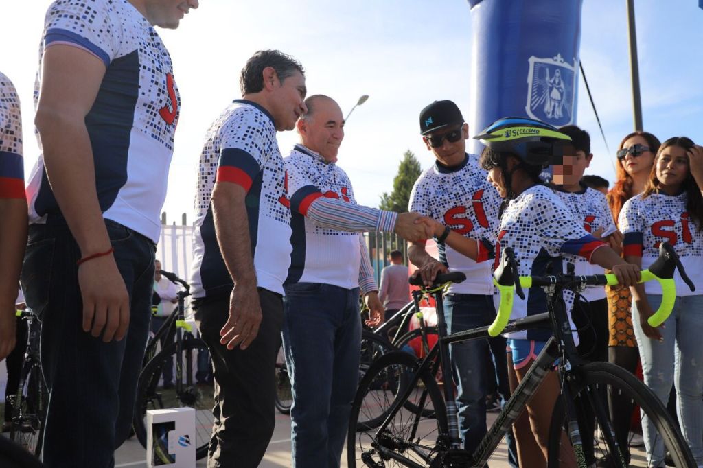 El ciclista internacional Nairo Quintana, el alcalde Enrique Galindo y el más importante pedalista mexicano de la historia, Raúl Alcalá; entregaron bicicletas de ruta y montaña a niñas, niños y jóvenes potosinos en el Centro Deportivo Los Vergeles al norte de la Capital. Los beneficiaron también recibieron jersey y casco, indumentaria con la que iniciará su camino dentro de la disciplina.