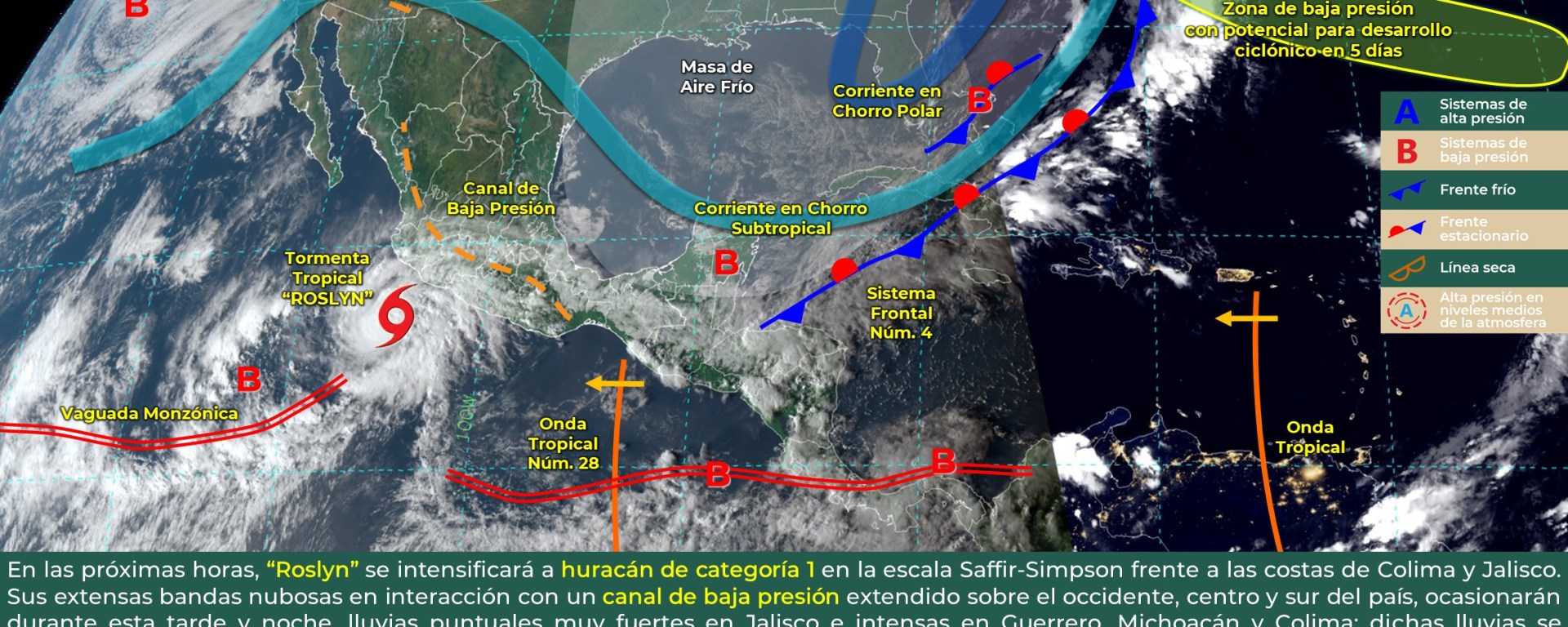 Lluvias intensas con puntuales torrenciales (150 a 250 mm): Jalisco y Nayarit.