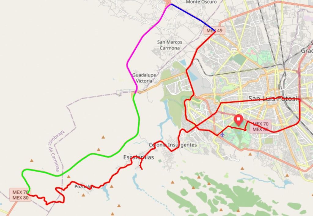 Después de este punto, retornarán por Carretera a Zacatecas al Circuito Potosí, en dirección al Nuevo Libramiento y tomarán la glorieta de carretera a Guadalajara hacia bulevar Rocha Cordero, para incorporarse a la avenida Chapultepec e ingresar por el acceso de esta avenida al Parque Tangamanga, concluyendo al interior del mismo.