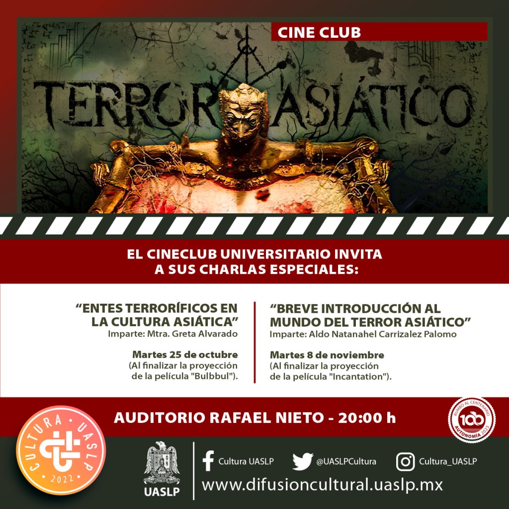 La Universidad Autónoma de San Luis Potosí a través de la Secretaría de Difusión Cultural y el Cine Club, presentará a partir del próximo martes 25 de octubre y durante todo el mes de noviembre, el ciclo de cine “Terror Asiático”, mismo que consta de cinco filmes, así como de charlas por parte de expertos cinéfilos. Todas las películas serán proyectadas en el Auditorio Rafael Nieto en punto de las 18:30 horas.