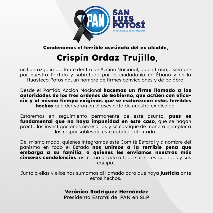 La presidenta del Comité Directivo Estatal del Partido Acción Nacional (PAN) en San Luis Potosí, Verónica Rodríguez condenó el asesinato de Ordaz Trujillo, a quien describió como “un panista comprometido con Ébano y con la Huasteca”.