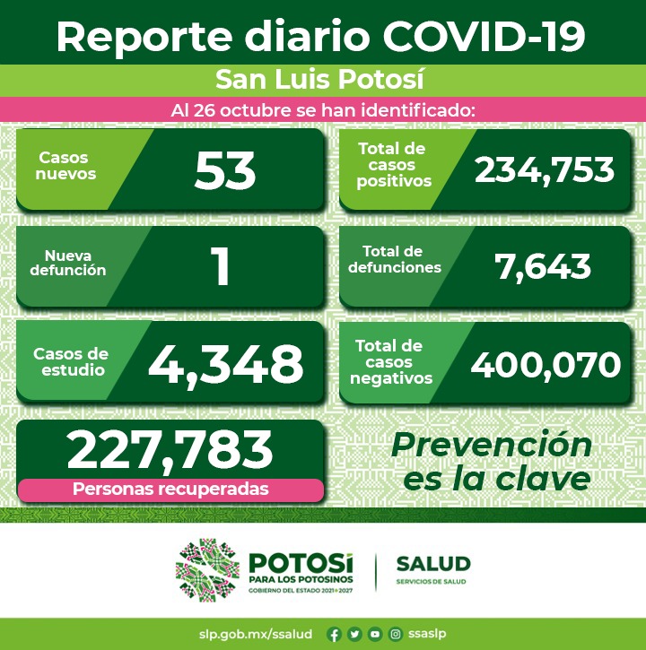 Este día se registró una nueva defunción, por lo que la cifra de muertes en el Estado aumenta a 7 mil 643.este deceso es de una mujer de 70 años de edad con esquema de vacunación completo e hipertensión, edad y enfermedad inmunosupresora como factores de riesgo. Sobre los estudios de nuevos casos, 39 son mujeres y 14 hombres en un rango de edad de 21 a 73 años. Seis personas se encuentran hospitalizadas, de las cuales ninguna requiere de respiración asistida.