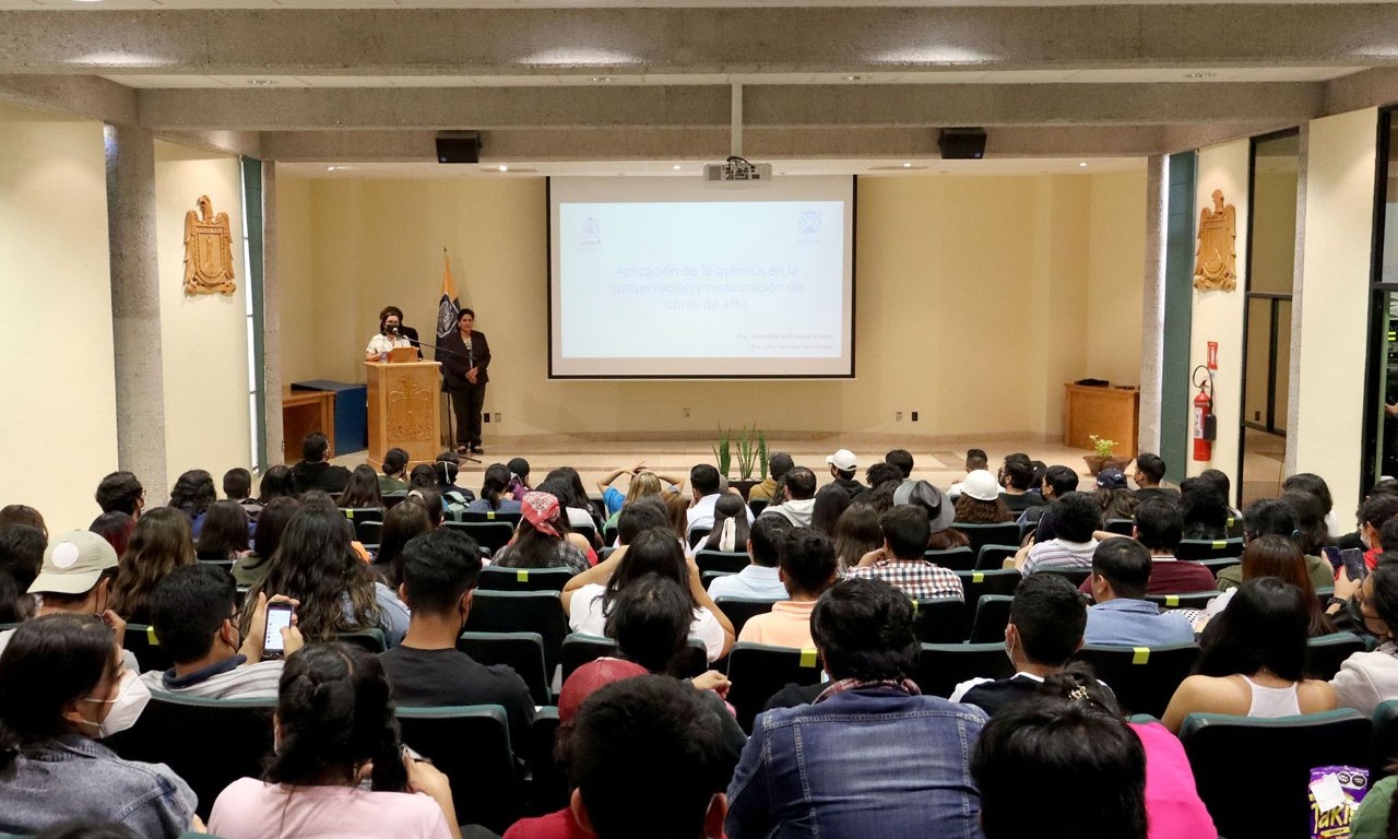 Las catedráticas investigadoras de la Facultad del Hábitat de la Universidad Autónoma de San Luis Potosí, las doctoras Lilia Narváez Hernández y Juana María Miranda Vidales, compartieron su experiencia como egresadas de la Facultad de Ciencias Químicas en el marco de la XXXV Semana del plantel, al presentar la conferencia “Aplicación de la Química en la conservación y restauración de obras de arte”, en el Auditorio “QI. Rogelio Jiménez Jiménez.