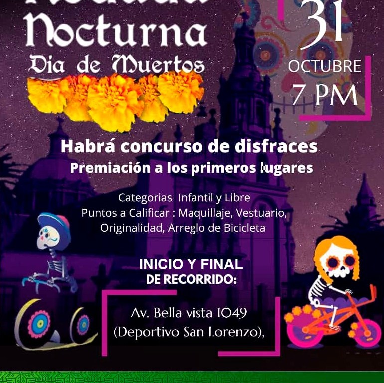 “La rodada dará inicio en punto de las 7 de la noche, todas las personas que vayan maquilladas, van a tener la oportunidad de concursar y vamos a estar dando muchísimos premios, en la categoría libre e infantil, habrá muchísimos premios para toda la gente que este disfrazada y quieran participar en este recorrido. Habrá un primero, segundo y tercer lugar en cada una de las categorías”, señaló.