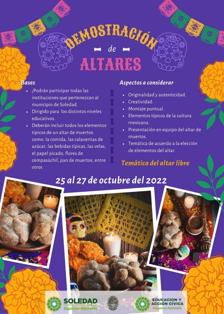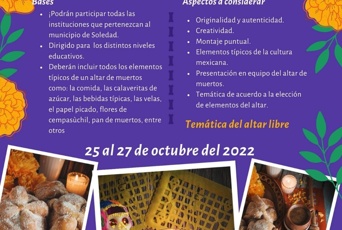 Por instrucciones de la alcaldesa de Soledad de Graciano Sánchez, Leonor Noyola Cervantes y con el fin de preservar las tradiciones, la Dirección de Educación a cargo de José Juan Castro Castillo, invita a las diferentes instituciones educativas a participar en la demostración de altares de muertos.