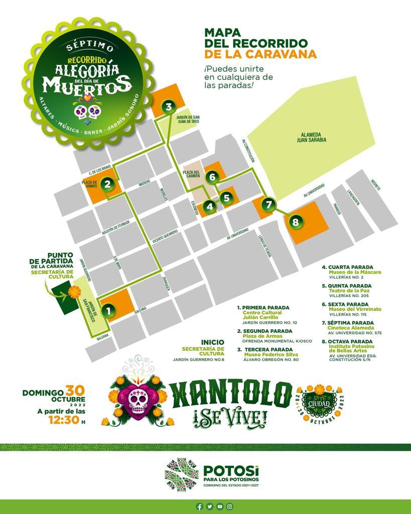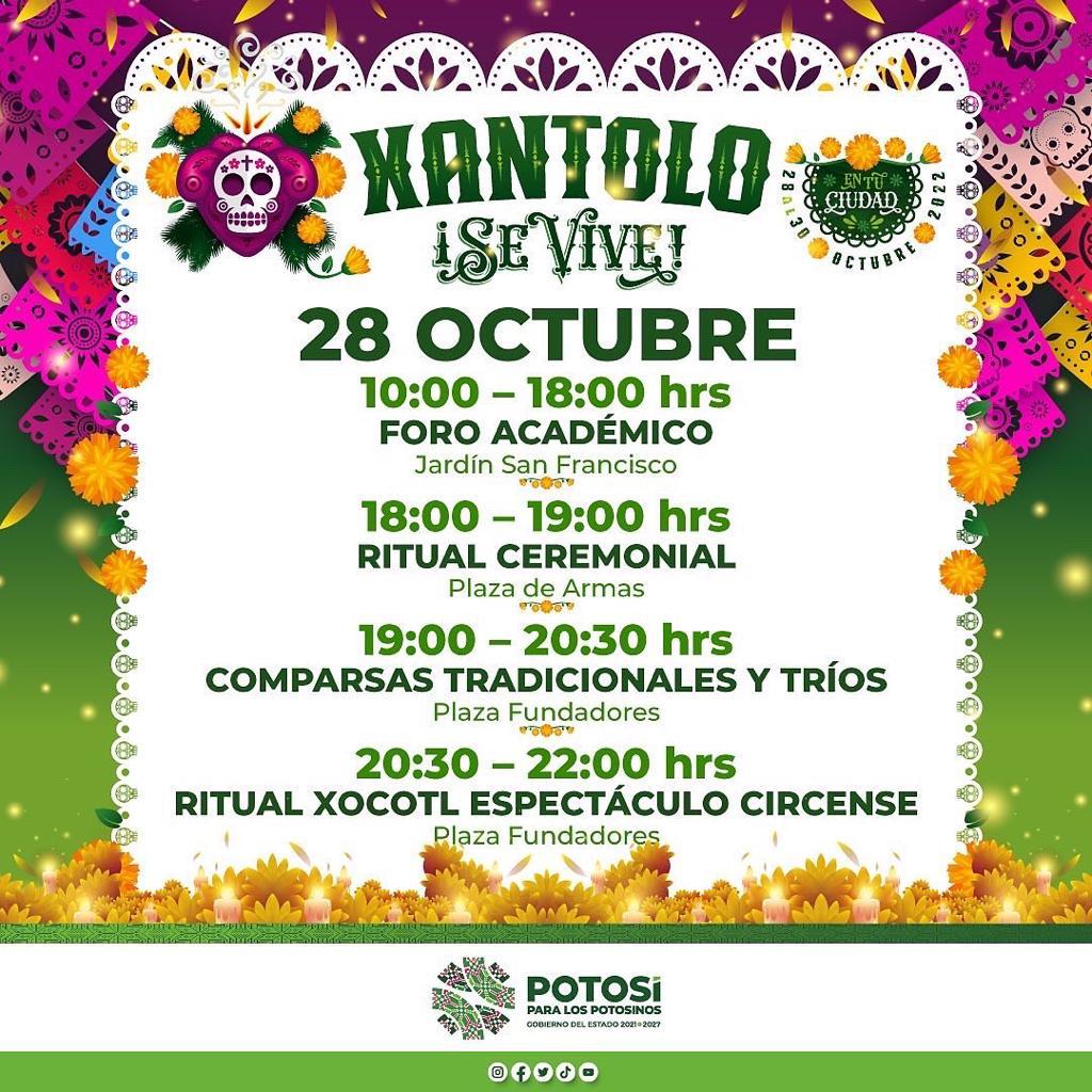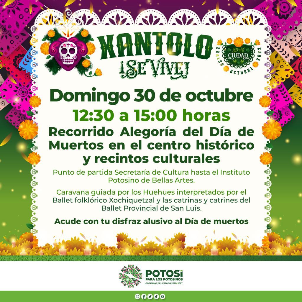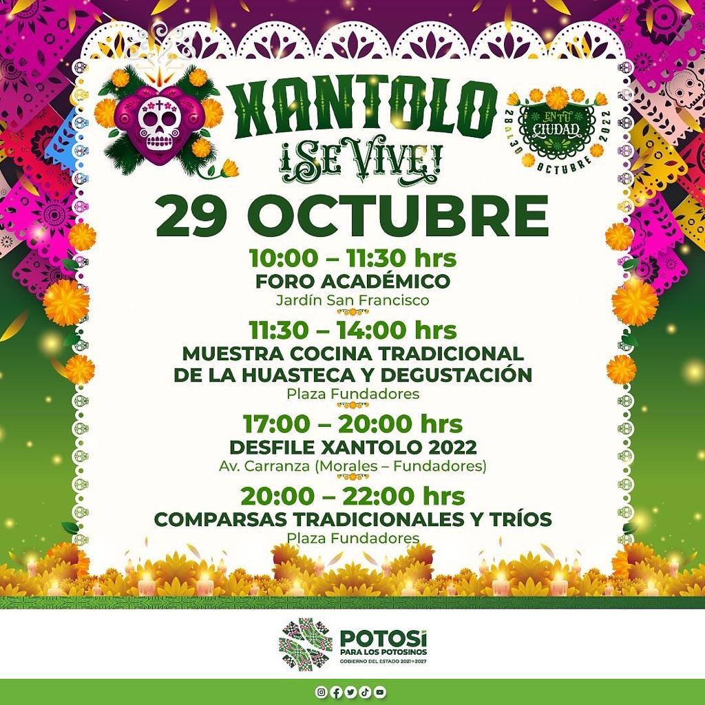 El sábado 29 de octubre, se llevará a cabo el Magno Desfile Xantolo 2022, a las 17:00 horas, con la participación de comparsas de la Huasteca potosina, del sector educativo, alebrijes iluminados, catrinas de Mexquitic, agrupaciones de la Secult, carros alegóricos, así como la participación de Guanajuato con mojigangas y danza chichimeca, con salida en el parque de Morales para llegar a plaza de los Fundadores, previa y posteriormente habrá música, foros y comparsas.