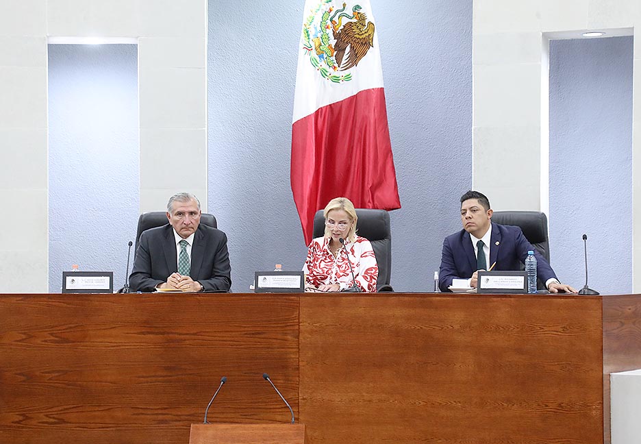 La legisladora Aranzazu Puente Bustindui, presidenta de la Directiva, dio la bienvenida al funcionario federal, en esta reunión para el intercambio de ideas en relación con esta reforma constitucional; en la que también participó el Gobernador del Estado, Ricardo Gallardo Cardona.