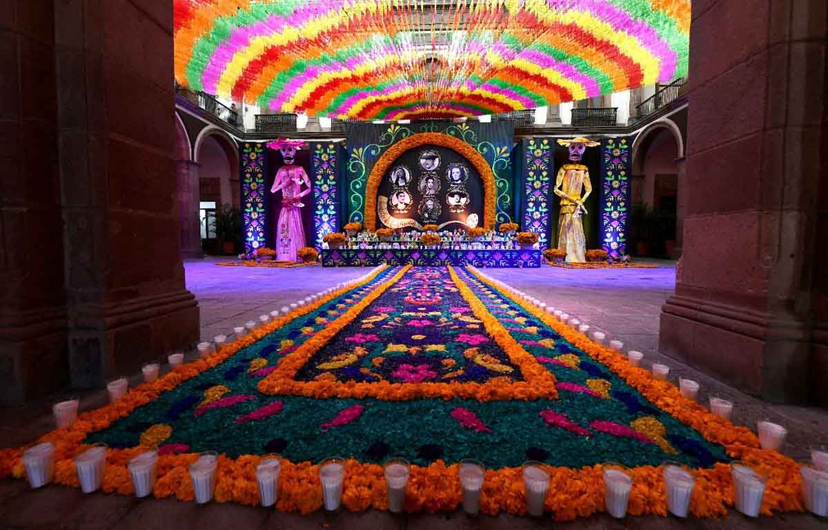 Superando todos los altares que por el Día de Muertos se han instalado en el Palacio de Gobierno en los últimos años, en esta ocasión se erigió en el patio central del inmueble un Altar monumental, fastuoso y colorido por parte de las Secretarías Particular y dirección de Relaciones Públicas del Gobierno del Estado.
