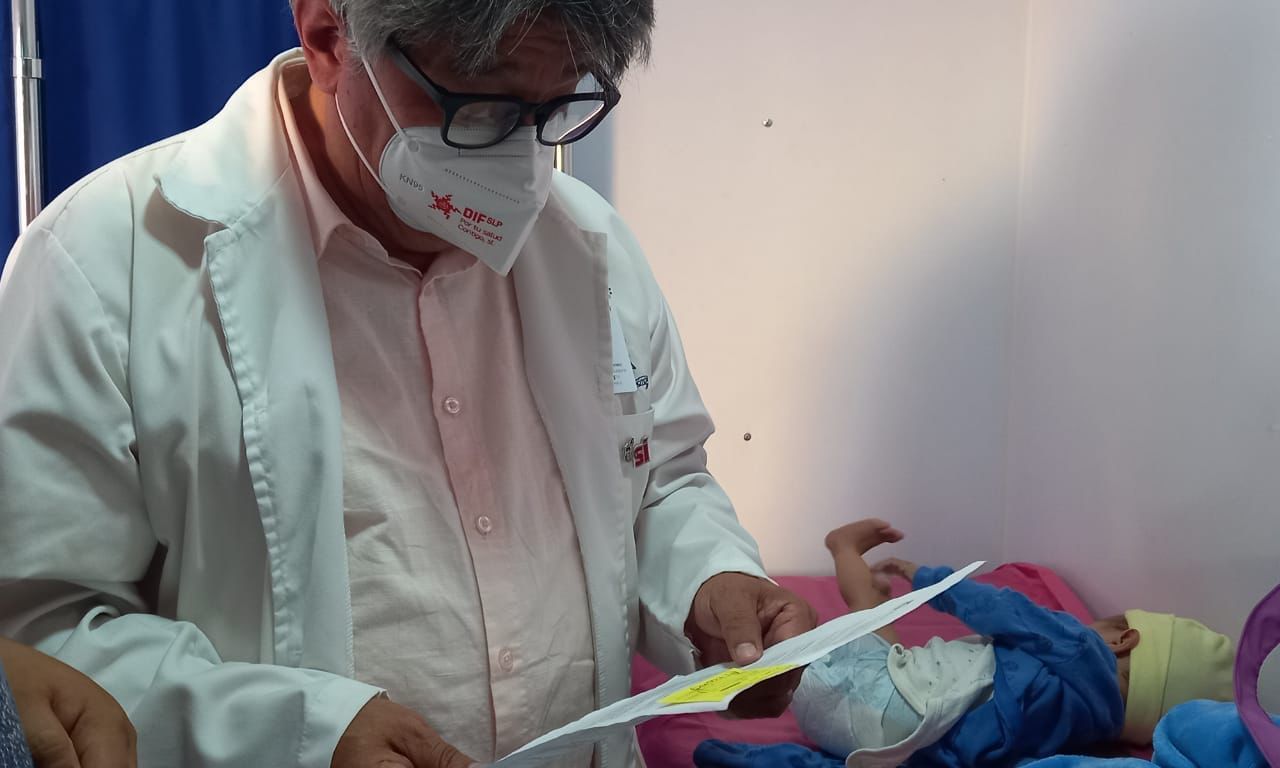 SLP.- Leonardo es un bebé de 8 meses, sin embargo, su apariencia lo hace ver de edad más corta debido a una condición en su cuerpo, su corazón se desarrolló «al revés», no tiene un vaso, y padece diversas enfermedades, según explicó su papá, quien este viernes acudió a «La Ruta de la Salud, DIF Municipal» que se llevó a cabo en Real de Peñasco, para atender a su pequeño por un padecimiento que requiere servicios médicos básicos.