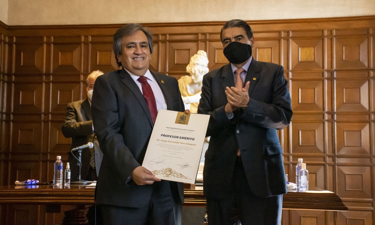 La Universidad Autónoma de San Luis Potosí, a través del H. Consejo Directivo Universitario, entregó reconocimiento como Profesor Emérito al doctor Jorge Fernando Toro Vázquez, profesor e investigador de la Facultad de Ciencias Químicas de la Institución.
