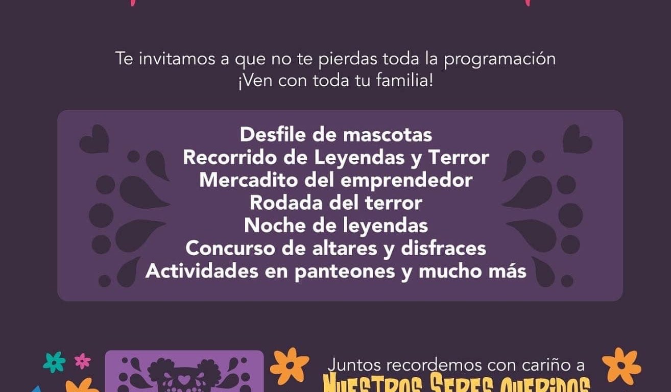 El lunes 31 de octubre, se realizará Desfile de Catrincitos y Catrincitas en la plaza principal y visitarán las diferentes oficinas de Palacio Municipal, para solicitar su tradicional calaverita; y se realizará el concurso al mejor disfraz de niño y niña. Por la tarde, se tiene programado el Concurso de Altares, por lo que la invitación es para todos los planteles educativos, para que participen en esta actividad que se realizará a las 17:00 horas en el Jardín Principal.